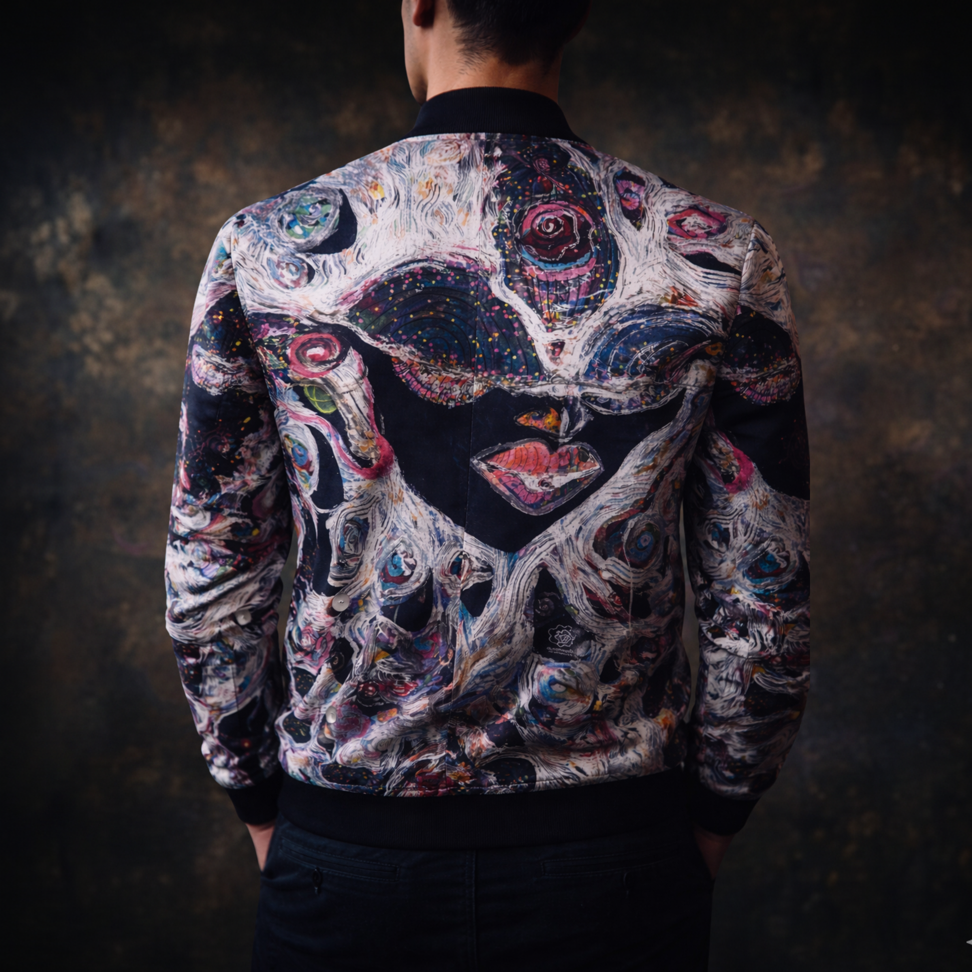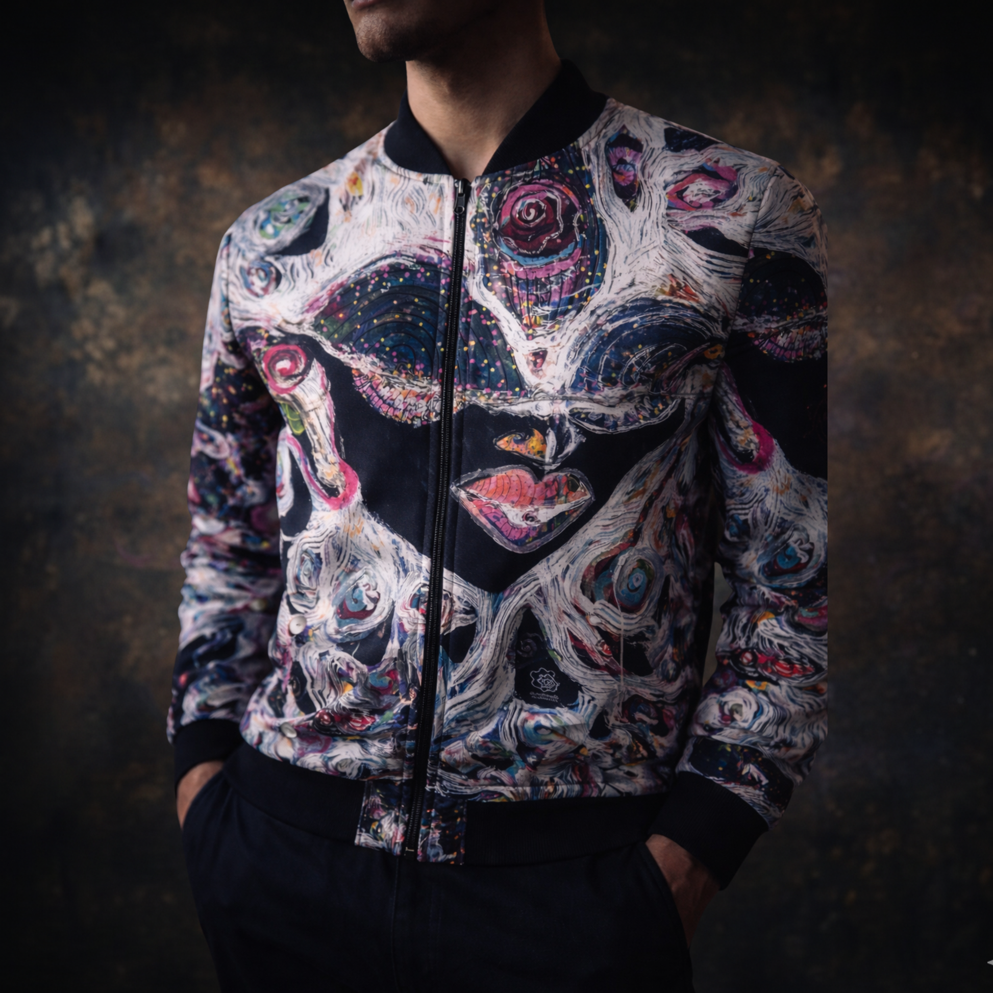 The expressive face, organic textures, and dynamic contrasts of the original painting are printed in full on both the front and back of this premium bomber jacket. Every angle feels intentional, every surface alive with emotional texture.